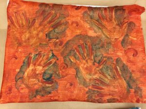 Pastepaper with a decoration created by using the tines of a fork, and my own hands to create the hand silhouettes