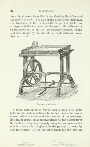 "The process of sawing grooves across the spine of the gathered sections of a book for reception of the cords used in sewing a book on recessed (sawn-in) cords."<ref name="Etherington">Roberts, Matt T. and Don Etherington. "Sawing in". Bookbinding and the Conservation of Books, A Dictionary of Descriptive Terminology. Conservation Online, 1994. Web. 29 March 2016.</ref>